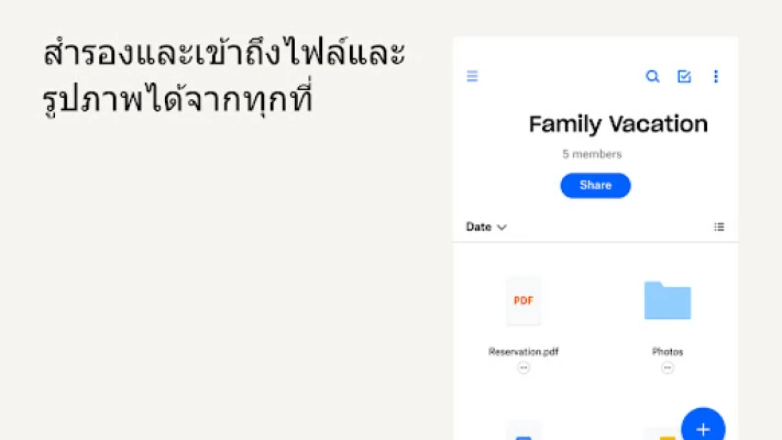 ปลดล็อกอิสระในการจัดการไฟล์ดิจิทัลของคุณด้วย Dropbox ไม่ว่าจะเป็นภาพถ่ายวิดีโออันล้ำค่า หรือเอกสารสำคัญ Dropbox คือศูนย์กลางที่ช่วยให้คุณจัดเก็บ จัดระเบียบ และเข้าถึงทุกสิ่งได้อย่างง่ายดาย ไม่ว่าจะอยู่ที่ไหนก็ตาม บอกลาการกังวลเรื่องพื้นที่จัดเก็บเต็มบนอุปกรณ์ของคุณ เพราะ Dropbox จะทำการอัปโหลดรูปภาพและวิดีโอจาก Camera Roll ของคุณขึ้นสู่คลาวด์โดยอัตโนมัติ เพื่อให้ทุกความทรงจำปลอดภัยและพร้อมแบ่งปันเสมอ คุณยังสามารถเข้าถึงไฟล์ทั้งหมดของคุณได้แม้ในขณะออฟไลน์ และเปิดดูไฟล์ได้มากกว่า 175 รูปแบบ โดยไม่จำเป็นต้องมีซอฟต์แวร์พิเศษใดๆ
