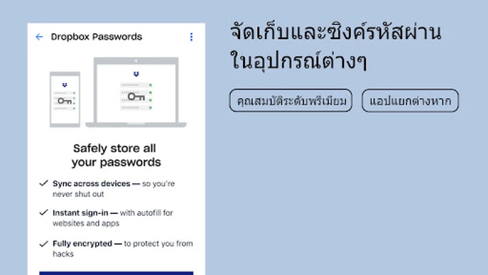 Dropbox คือผู้นำด้านโซลูชันคลาวด์ที่ได้รับความไว้วางใจจากผู้ใช้ทั่วโลกและบริษัทชั้นนำระดับ Fortune 500 ในการปกป้องข้อมูลอันละเอียดอ่อนที่สุดขององค์กร ด้วยผู้ใช้งานแบบชำระเงินกว่า 14 ล้านราย เรายืนหยัดในความมุ่งมั่นด้านความปลอดภัยและความเป็นส่วนตัวสูงสุด ให้คุณวางใจได้ไม่ว่าจะอยู่ที่ไหนหรือกำลังทำอะไรอยู่ ลงทะเบียนเพื่อสัมผัสประสบการณ์ Dropbox Plus พร้อมพื้นที่จัดเก็บข้อมูลขนาดใหญ่ 2 TB (2,000 GB) ซึ่งเพียงพอสำหรับทุกอุปกรณ์ของคุณ พร้อมด้วยฟีเจอร์ Dropbox Rewind ที่ให้คุณย้อนเวลากลับไปกู้คืนไฟล์ โฟลเดอร์ หรือแม้แต่ทั้งบัญชีได้นานถึง 30 วัน ให้ Dropbox เป็นโซลูชันการจัดเก็บไฟล์ จัดระเบียบ และแบ่งปันไฟล์แบบเบ็ดเสร็จสำหรับทุกอุปกรณ์ของคุณ ไม่ว่าจะเป็น Android, iPhone, Mac หรือ PC
