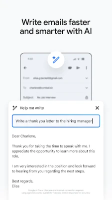 Gmail ไม่ใช่แค่แอปอีเมล แต่เป็นส่วนสำคัญของ Google Workspace ที่ช่วยให้คุณและทีมทำงานร่วมกันได้อย่างไร้ขีดจำกัด ตอบรับคำเชิญใน Google ปฏิทินได้โดยตรงจากแอป และสำหรับผู้ใช้งาน Wear OS คุณยังสามารถเพิ่มข้อมูลสรุปอีเมลบนหน้าปัดนาฬิกาเพื่อดูข้อมูลสำคัญได้อย่างรวดเร็ว แพลตฟอร์มนี้ช่วยให้คุณสนทนากับเพื่อนร่วมงานผ่าน Google Chat, ประชุมออนไลน์ด้วย Google Meet, ส่งคำเชิญในปฏิทิน หรือเพิ่มรายการสิ่งที่ต้องทำได้โดยไม่จำเป็นต้องออกจากแอป Gmail ใช้ประโยชน์จากคำแนะนำที่ขับเคลื่อนด้วย AI เช่น ฟีเจอร์ช่วยเขียน หรือคำแนะนำด้านไวยากรณ์ เพื่อให้งานของคุณถูกต้องแม่นยำและรวดเร็วขึ้น พร้อมมั่นใจในความปลอดภัยระดับองค์กรที่บล็อกภัยคุกคามได้มากกว่า 99.9% ช่วยให้คุณใช้เวลาได้อย่างมีประสิทธิภาพสูงสุด
