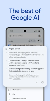 ยกระดับการทำงานร่วมกันในทีมของคุณด้วย **Chat** แพลตฟอร์มการสื่อสารอัจฉริยะจาก **Google Workspace** ที่ผสานรวมเทคโนโลยี AI ขั้นสูงและเสริมประสิทธิภาพด้วย Gemini สัมผัสประสบการณ์การสรุปบทสนทนาที่รวดเร็ว ช่วยให้คุณตามทันข้อมูลสำคัญได้เสมอ การแปลข้อความอัตโนมัติรองรับกว่า 120 ภาษา ทำให้ภาษาไม่ใช่กำแพงกั้นอีกต่อไป ค้นหาสิ่งที่ต้องการได้อย่างแม่นยำด้วยระบบ AI ที่ชาญฉลาด และไม่พลาดทุกขั้นตอนการทำงานด้วยคุณสมบัติการบันทึกรายการกิจกรรมที่ชัดเจน ให้ทั้งทีมเข้าใจตรงกันอยู่เสมอ