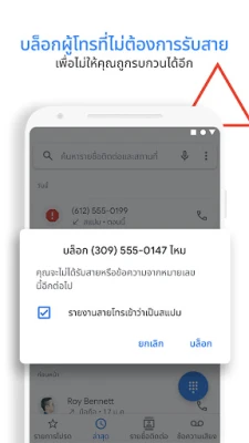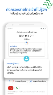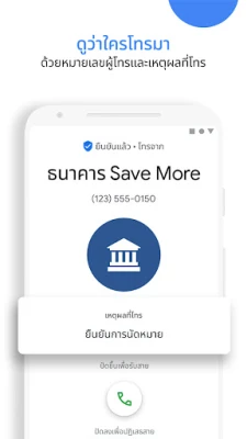อีกทั้งยังช่วยให้คุณทราบว่าใครกำลังโทรหาคุณ ด้วยพลังจากฐานข้อมูลหมายเลขผู้โทรขนาดใหญ่ของ Google ที่จะระบุข้อมูลธุรกิจสำคัญ ทำให้คุณรับสายได้อย่างมั่นใจ ไม่ต้องคาดเดาอีกต่อไป